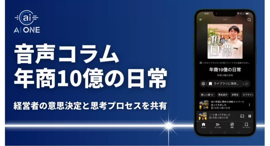 「AI時代の最前線で、あなたの可能性を解き放つ」を理念に掲げ、AIスクール「AI ONE」を運営する株式会社AI ONE(所在地:神奈川県横浜市、代表取締役:森谷和正)は、森谷和正による音声コラム「年商10億の日常」の配信を、2025年12月5日より開始いたしました。