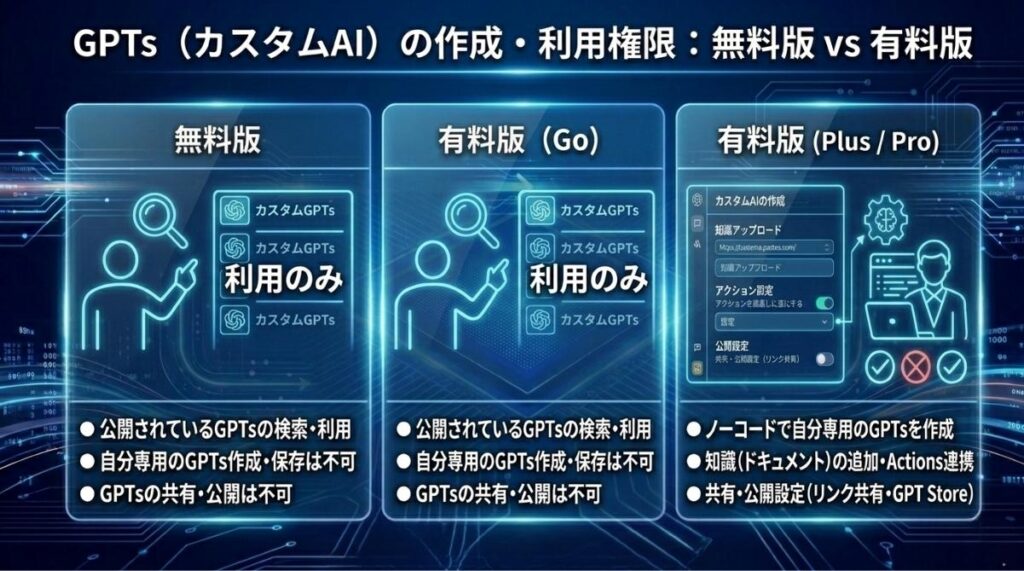 自分専用の便利なAIを自由に作れる「GPTs」も、プランによって使い勝手が大きく変わります。