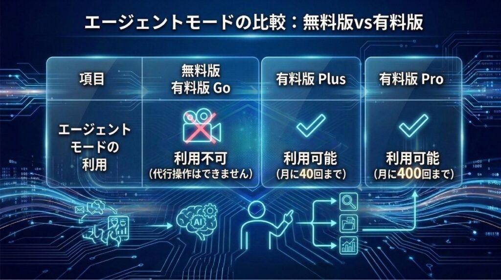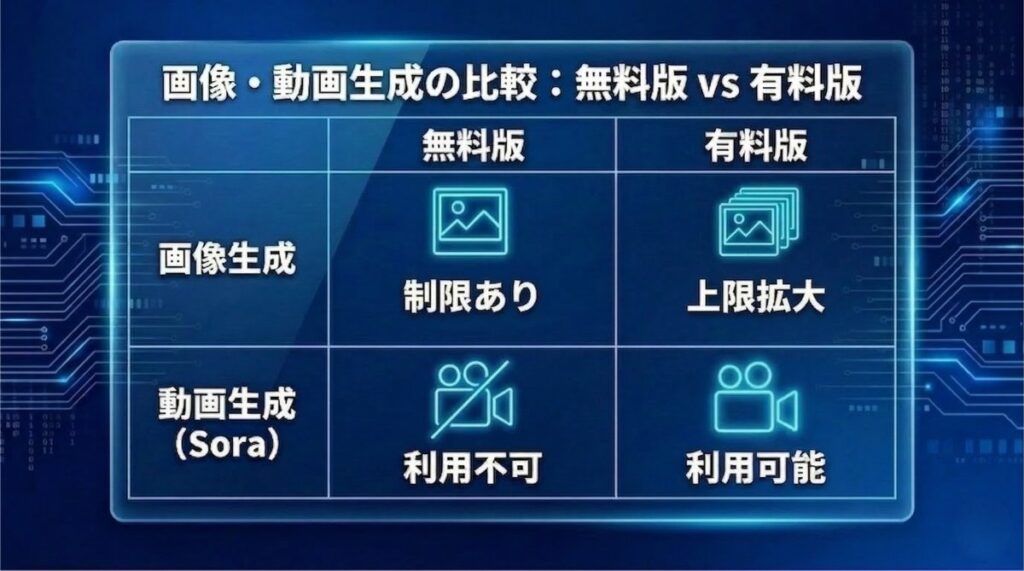 - 動画生成(Sora)や便利な自動化機能が使えない