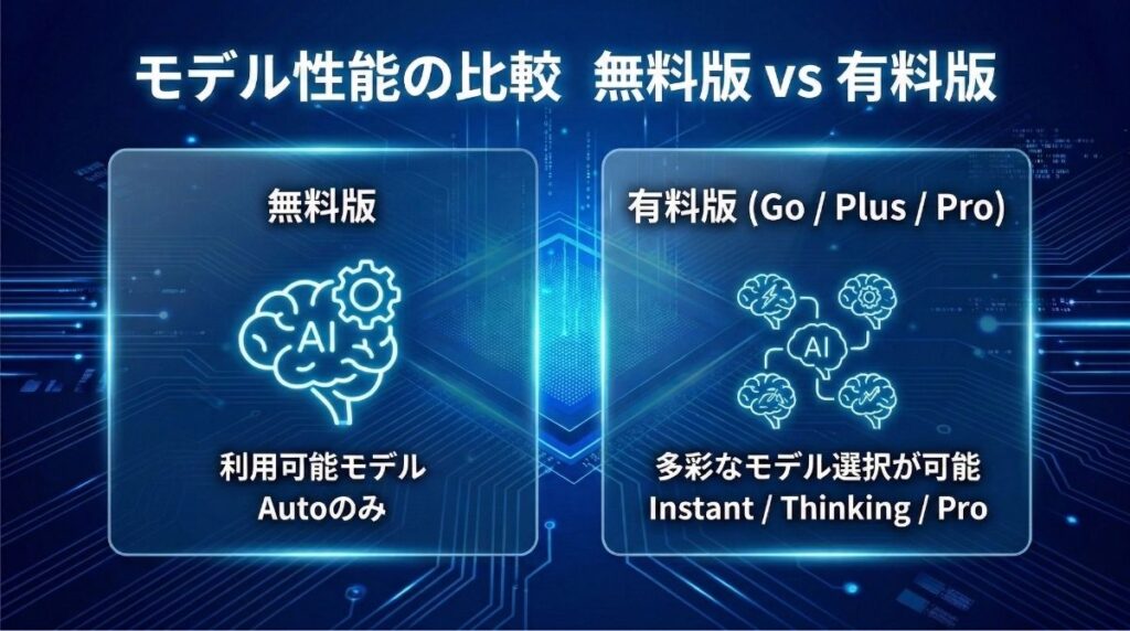 一方で、有料版(Go/Plus/Pro)では、用途に合わせてAIモデルを自由に切り替えられるようになります。