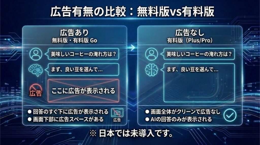 無料版やGoプランでは、AIの回答が終わったすぐ下のスペースに、スポンサー広告が表示されます。