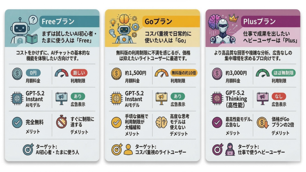 「Go」の登場によって、これまでの「無料か、高いPlusか」という極端な二択ではなく、自分の利用スタイルに合わせた柔軟なプラン選びが可能になりました。