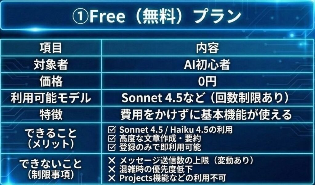 Claudeを無料で試したいなら、まずはこのFreeプランからスタートするのが良いでしょう。